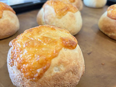 プチッと可愛いほんのり甘いパン♡ お米生地を手で捏ね、まぁるく丸める作業を学び、ステップアップへ繋げます。