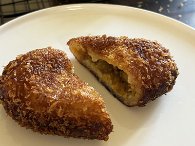 お米でカレールゥを習った者だけが知る お米ルゥ そのルゥを使い、牛煮込みカレーをふわふわお米生地で包み揚げる。 カレールゥ未受講者は+500円
